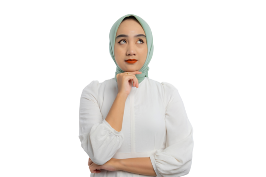 Thoughtful young Asian woman in green hijab and white blouse looking up, touching chin, thinking about something isolated on transparent background