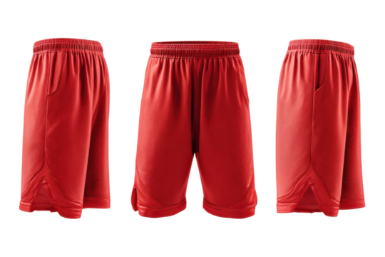 Red sportswear pants isolated on transparent background. Three red athletic shorts displayed front side and angled views studio lighting isolated on white background.