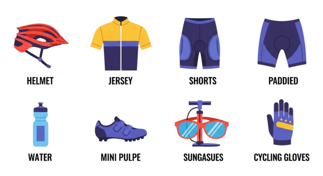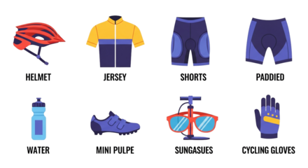 An illustrated collection of cycling gear, including a helmet, jersey, shorts, padded shorts, water bottle, shoes, sunglasses, and gloves, arranged on a white background.