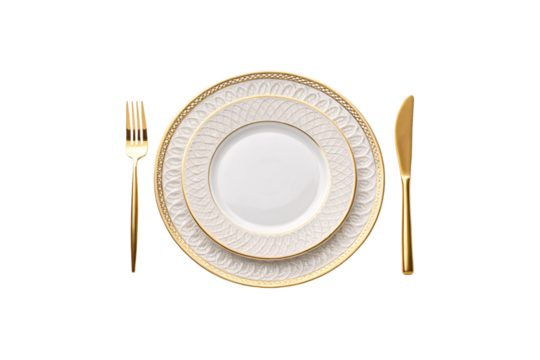 Luxurious dinner set featuring embossed gold designs on plates with matching gold flatware, combining traditional elegance with contemporary style, isolated on a transparent background