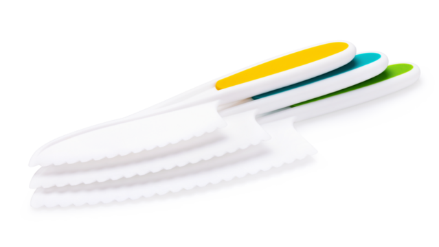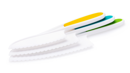 Three children's plastic knives lying on each other, isolated on white background