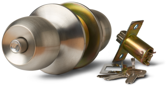 close-up of silver door knob locks with fittings, traditional and minimalist style round or cylindrical knobs for internal wooden and plastic doors, selective focus with isolated on white background