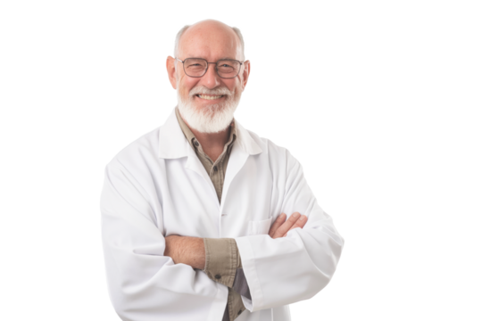 Elderly Male Doctor in White Lab Coat Smiling with Arms Crossed on White Background