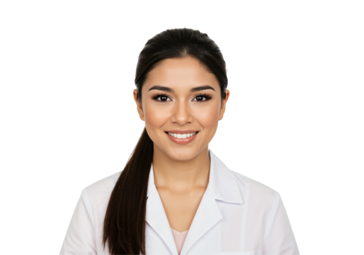 Confident young woman in a white lab coat smiling, hands in pockets. Healthcare, medical, and scientific professional. Transparent background