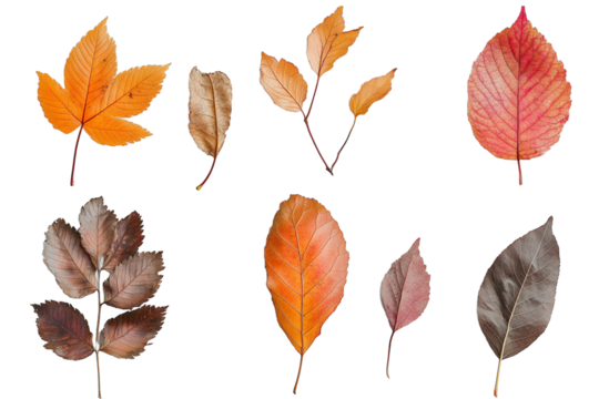 Autumn leaves arranged in a decorative pattern isolated on a transparent background.