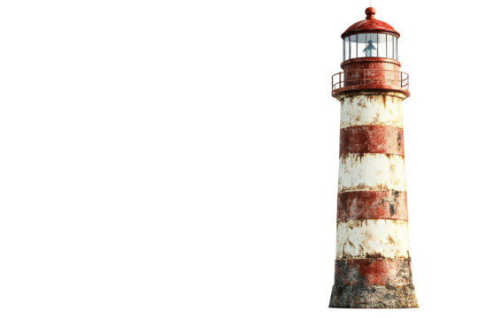 tall, weathered lighthouse with red and white striped design, standing against plain background. Its structure showcases rust and wear, evoking sense of history and resilience