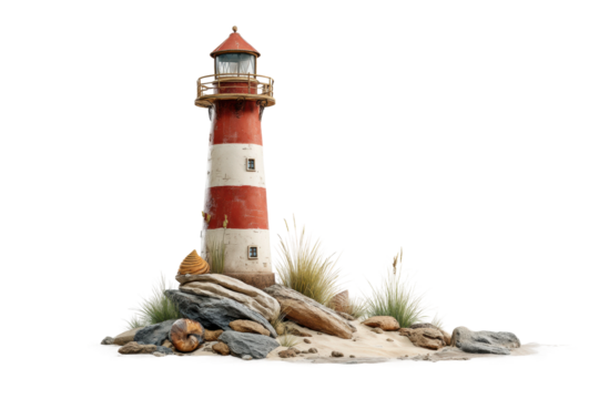 Red and White Lighthouse on Rocky Coastline isolated on transparent background