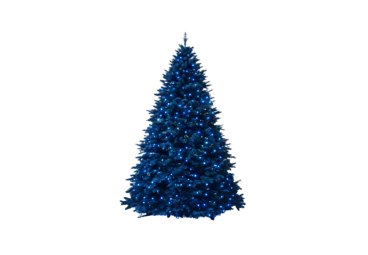 Blue spruce Christmas tree illuminated with twinkling white lights against plain backdrop, isolated on a transparent background