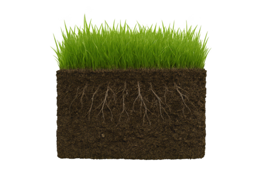 Cross-sectional block of soil with vibrant green grass and visible root system on a transparent background