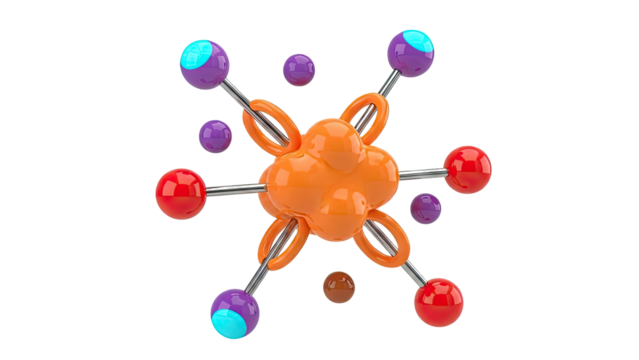 A 3D atom molecule model with connected spheres and bonds, isolated on a white or transparent  png background, symbolizing science, chemistry, and structure.