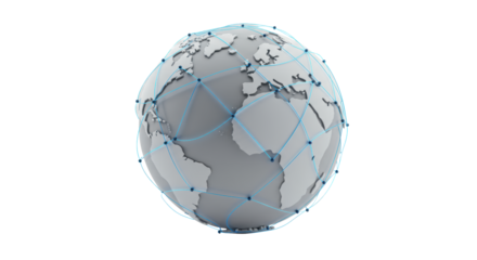 Stylized, minimalist Earth globe in clean greys with a glowing electric blue digital network overlay on a transparent studio background, concept of seamless worldwide communication