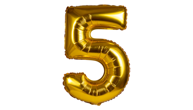 A shiny golden balloon shaped like the number 5 isolated on a white background, perfect for birthdays, celebrations, or party-themed designs.