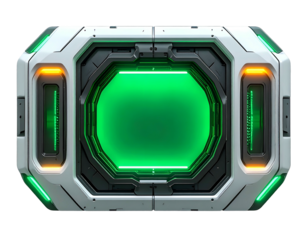 Futuristic, geometric, glowing green screen within a white and gray device