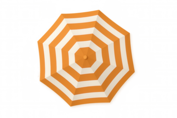 Orange and white striped beach umbrella from top view protecting from sun, summer vacation concept