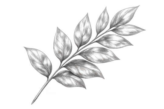 Botanical leaf branch hand drawing in pencil sketch style with monochrome foliage for design elements