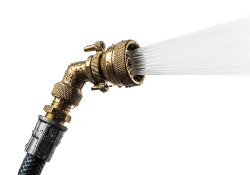 extreme close-up of a vintage brass hose nozzle attached to a wet industrial rubber pipe, powerfully releasing a frozen jet of atomized water and mist, isolated on a stark white background. concept