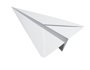 White paper airplane flying against a transparent background, symbolizing creativity and simplicity in design and communication