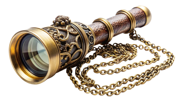 -old-steampunk-magnifying-glass-telescope-with-chain isolated on white background