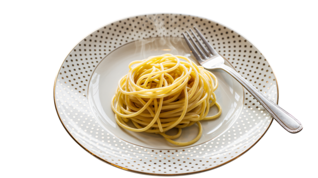 Steaming spaghetti served elegantly on a white plate with gold polka dots