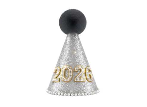 Sparkling 2020 Celebration Hat: Silver Glitter Party Cone with Gold Numerals & Black Pompom on White on white background Isolated on Transparent Background