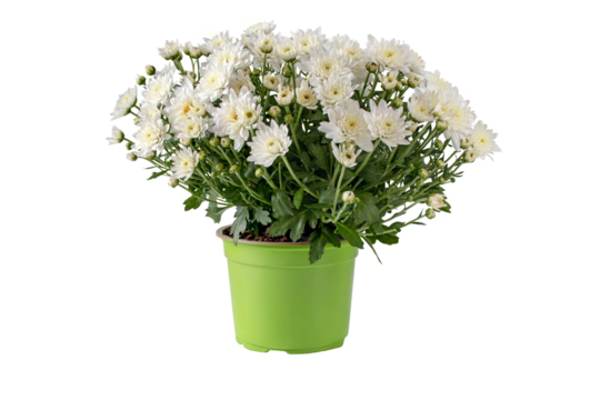Chrysanthemum multiflora bush in the pot isolated transparent png. White flowers and buds autumnal bouquet.