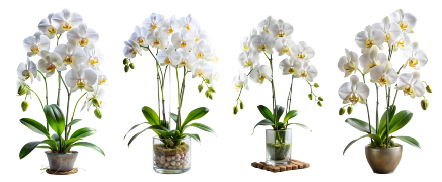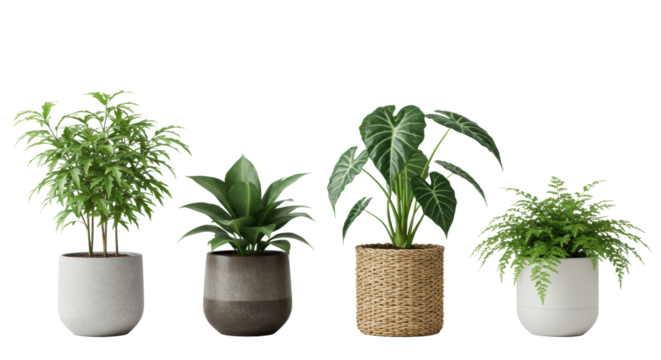 Four distinct, healthy indoor potted plants in modern neutral pots on a transparent background with copy space, showcasing natural growth and sustainable living
