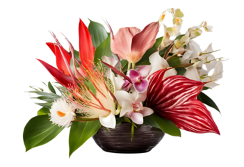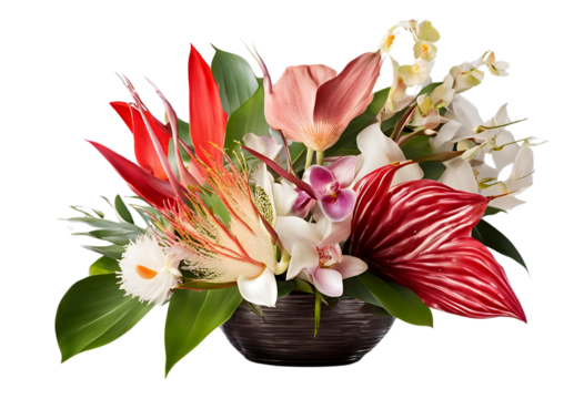 An elegant bouquet of exotic flowers, protea, anthurium, and orchids, isolated on a bright white background, soft diffused studio lighting, ultra-realistic botanical shot