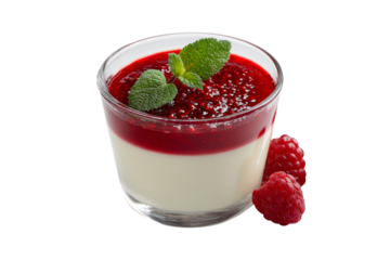 Pair of gourmet layered chocolate–orange pudding jars with cream topping isolated on transparent background