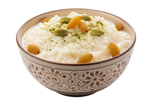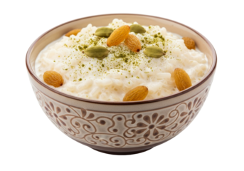 creamy rice pudding with almonds and pistachios in decorative bowl