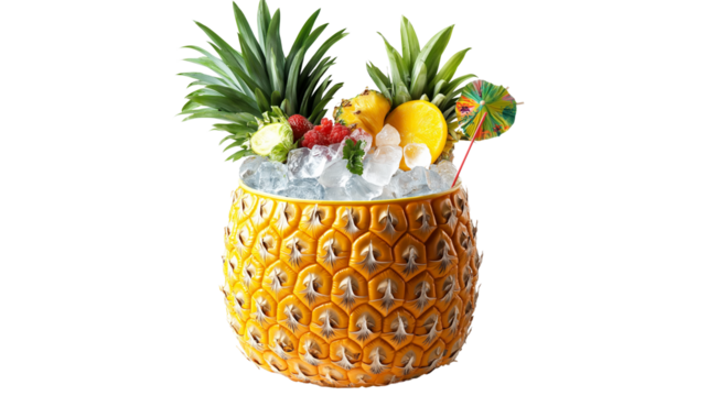 Pineapple-shaped cooler filled with ice cubes and tropical drinks, white background, summer props, PNG