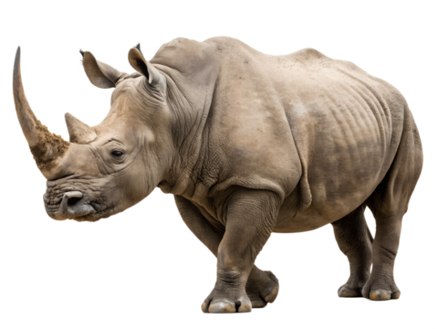 Powerful white rhinoceros standing, showcasing its thick skin and prominent horns, isolated on transparent background