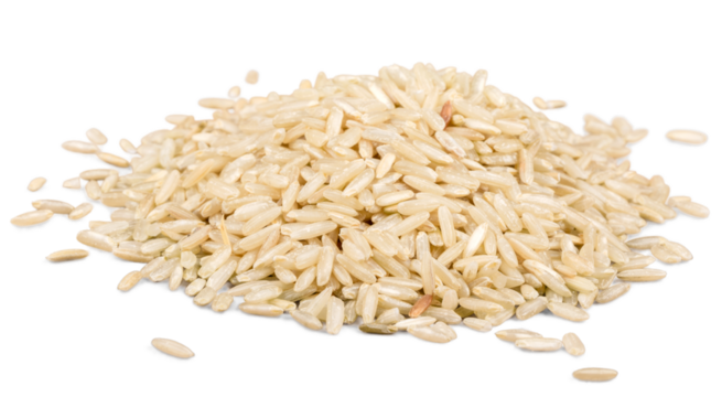 Heap of uncooked white rice with a wooden bowl, laid out on a transparent, white background for png usage