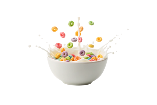 Colorful cereal bowl with milk splash, vibrant fruit loops flying upward in motion, isolated on a transparent background
