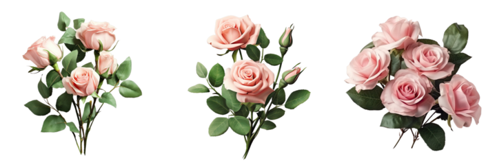Png Set Pink roses and green leaves arranged in a bouquet set against a transparent background