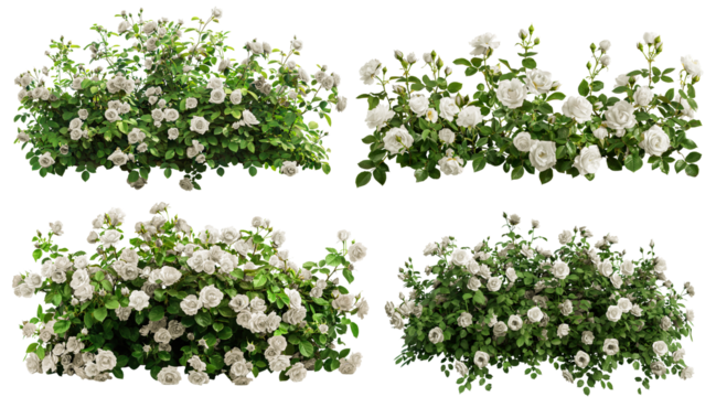 set of beautiful white roses with lush green leaves isolated on white or transparent background