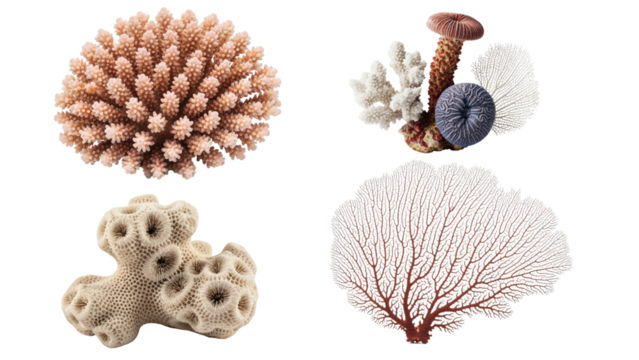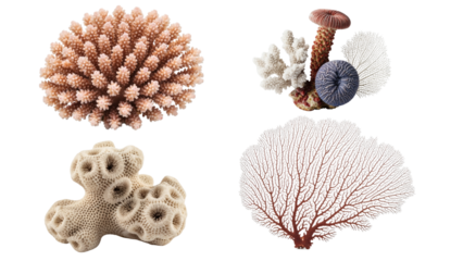 Four coral reef formations, showcasing diverse textures and colors. The underwater life forms appear isolated against a transparent background