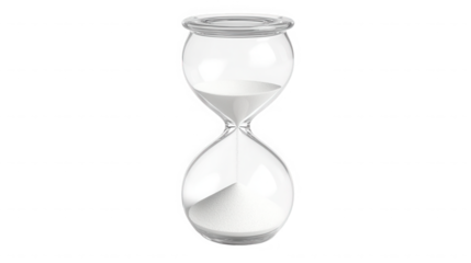 A clear glass hourglass with white sand , showing the passage of time on transparent background