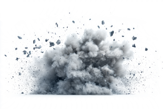 A dramatic cloud of smoke and debris bursting forth, creating an abstract pattern on a white canvas.