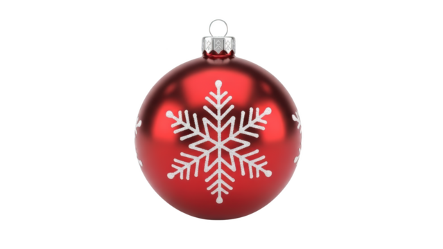 A red Christmas ornament ball with a white snowflake design hangs isolated on a white background.