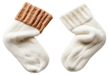A pair of white and brown knitted socks isolated on a white background, warm winter wool clothing, traditional Christmas pattern accessories, a soft cozy foot wear object.