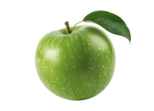 A vibrant green apple with white speckles and a stem with a leaf against a solid transparent background