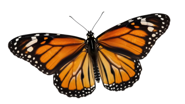 Monarch butterfly PNG isolated on transparent background, orange and black wings with white spots, beautiful insect for nature designs