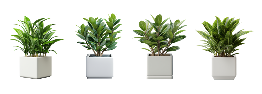 Set of Four Green Foliage Plants in White Square Pots, Isolate on Transparent Background
