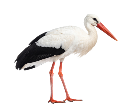 A detailed close-up of a white stork with a red beak, standing on one leg against a transparent background. background removed