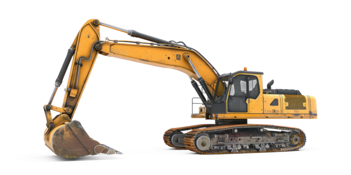 Powerful modern yellow excavator on tracks with digging bucket and hydraulic components, robust contemporary yellow wheel loader with front bucket, pristine, transparent studio background with soft