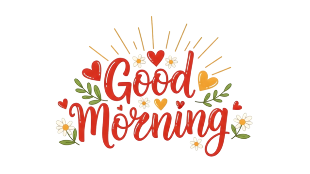 Good Morning text with hearts flowers and sunburst isolated on a transparent background