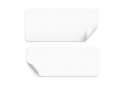 White blank stickers with curled corners, offering space for custom text or logo, transparent background