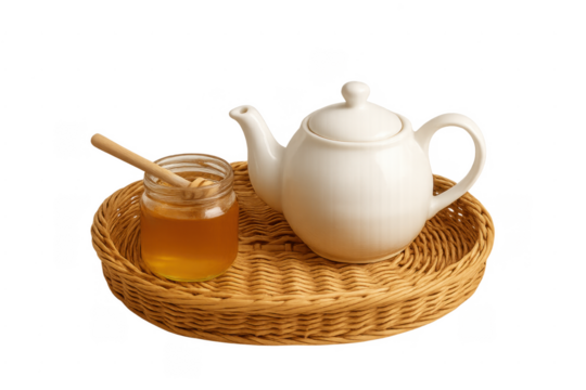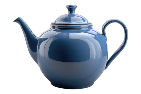 A hand pours hot tea from a white teapot into a clear glass mug isolated on transparent background