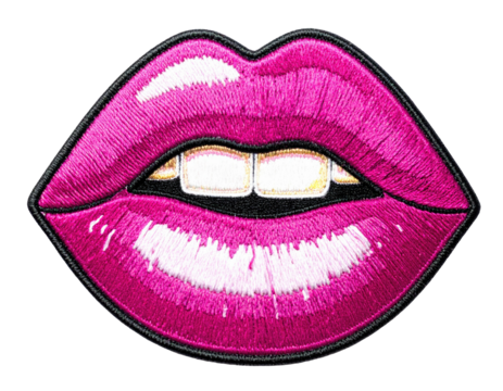 Embroidered patch of a vibrant pink mouth with black outline, featuring visible white teeth