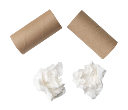 Front view set of screwed or crumpled tissue paper or toilet paper balls after use in toilet or restroom isolated with clipping path in png file format